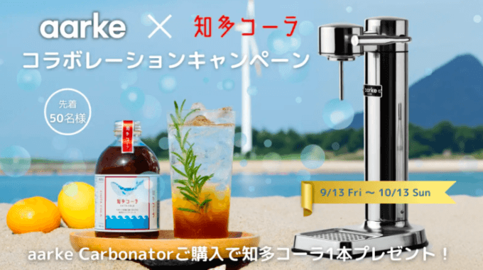 aarke公式サイトにて世界的⼈気炭酸⽔メーカー「Carbonator 3」または「Carbonator Pro」をご購入のお客様、先着50名様に知多コーラ1本(240mL)をプレゼントいたします。