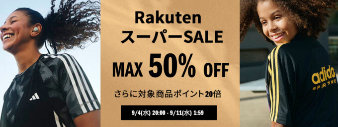 2024年9月11日(水)まで「楽天スーパーセール(RakutenスーパーSALE)」が開催され「adidas×RakutenスーパーSALE」特典が実施されています。