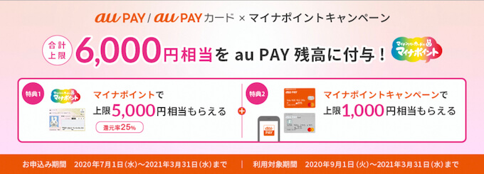 | 条件 | マイナポイント付与額に対して20%のau PAY 残高を付与 (申込期間:2020年7月1日~2021年3月31日) |
