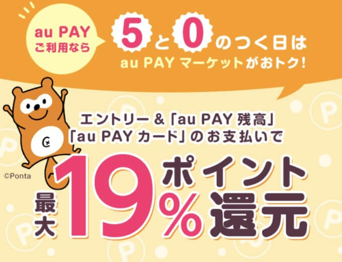au PAYマーケットでは「5と0のつく日」にエントリーをしてau PAY残高、またはau PAYカードで支払いすると最大でポイント19%が還元される特典を実施しています。