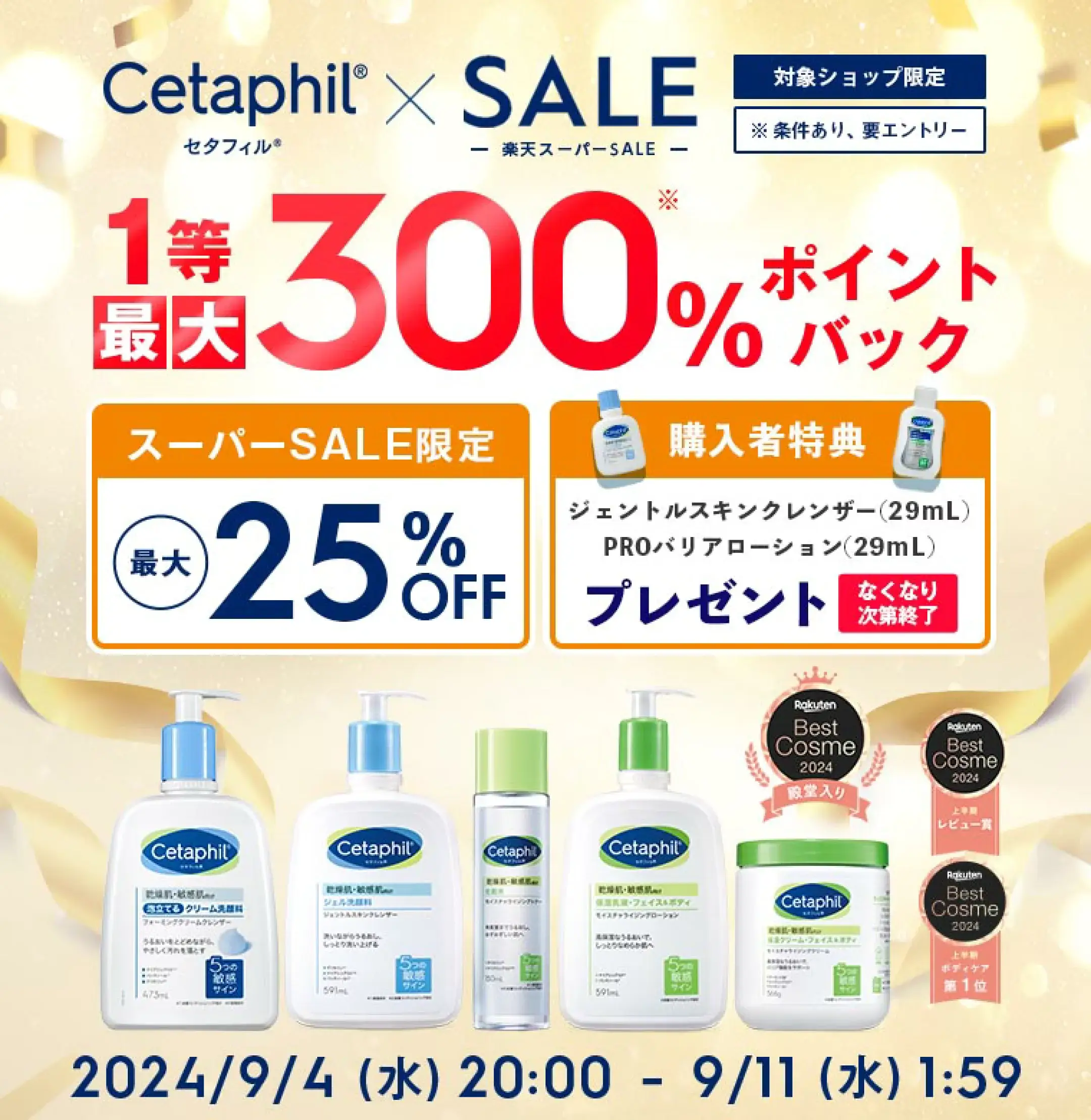 2024年9月11日(水)まで「楽天スーパーセール(RakutenスーパーSALE)」が開催され「Cetaphil×RakutenスーパーSALE」特典が実施されています。
