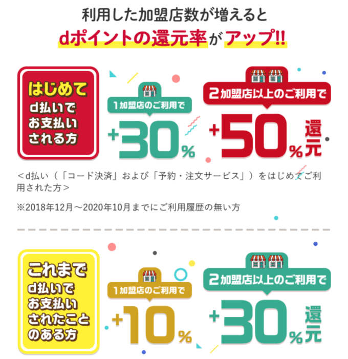 | +30%還元対象 | 2つの加盟店でd払い(コード決済)or d払い(ネット)の支払いをした人 |