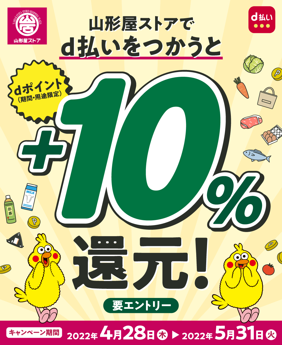 | キャンペーン 概要 | 期間中山形屋ストアでd払いを 利用すると会計額の+10%分を ポイントで還元 ※要エントリー |