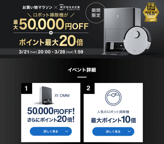 2022年12月17日(土)まで「楽天市場の超ポイントバック祭」が開催され「ECOVACS×超ポイントバック祭」特典が実施されています。