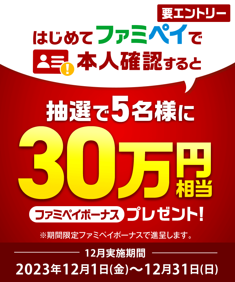 抽選で5名に30万円相当のファミペイボーナス(期間限定ファミペイボーナス)が進呈されます。