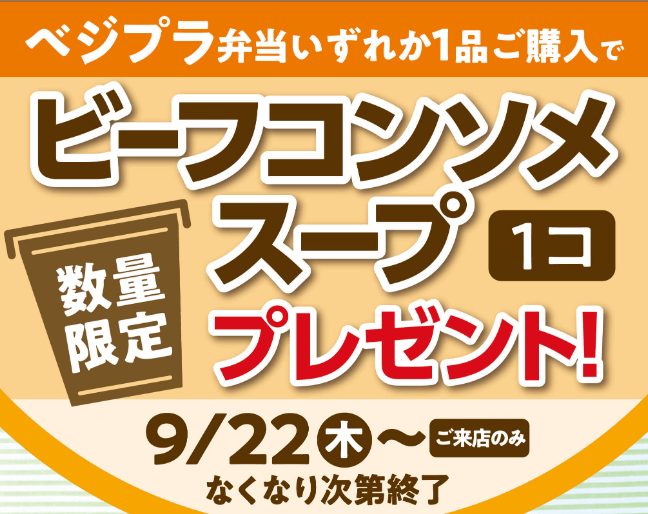 また2022年9月22日(木)のベジプラ弁当発売と合わせてビーフコンソメスープ(1コ)プレゼントキャンペーンも実施されています。