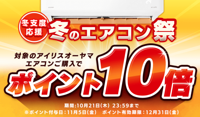 | キャンペーン 期間 | 2021年10月28日(木)15:59まで ※冬のエアコン祭は10月21日(木)まで |