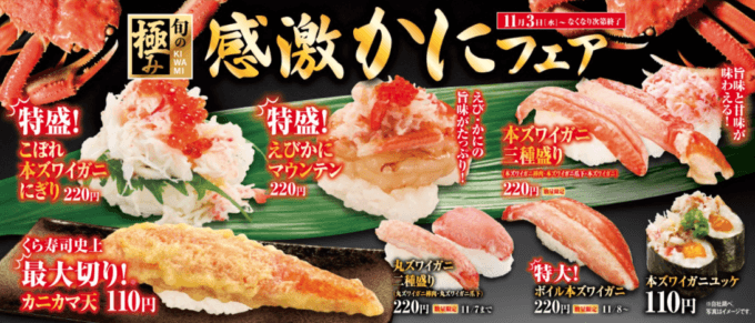 2021年11月3日(水)からくら寿司で旬の極み「感激かにフェア」が開催されています。