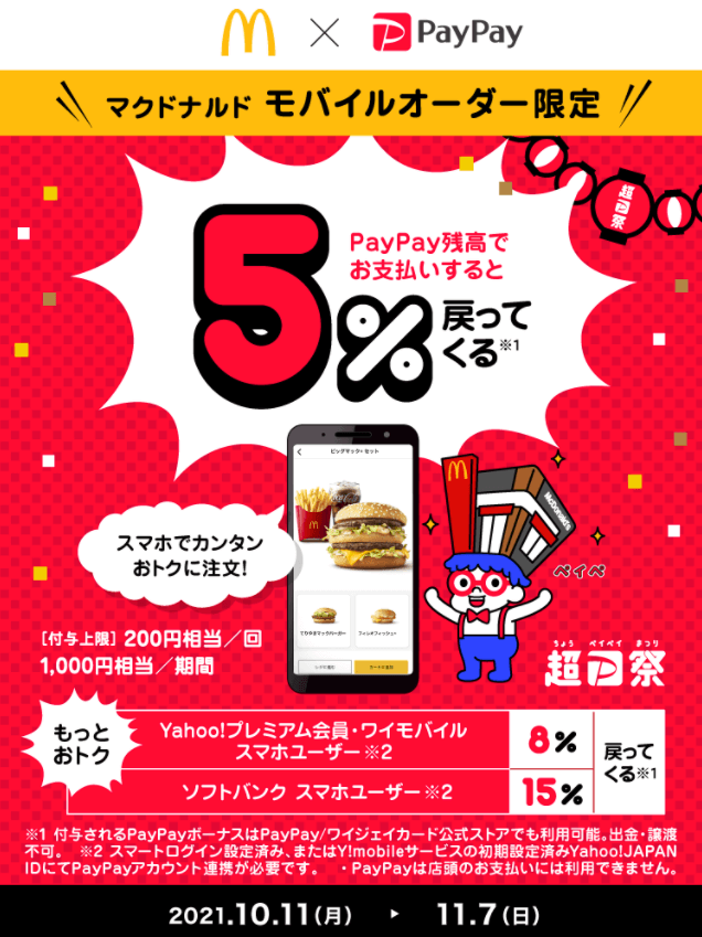 2021年11月7日(日)までマクドナルドのモバイルオーダーでPayPayがお得に利用できます。