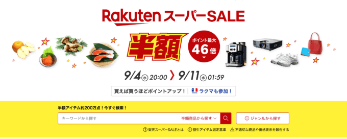 - 楽天スーパーセールが開催中!2024年9月11日(水)までポイント最大46倍や有名ブランド連動特典など豪華特典盛りだくさん