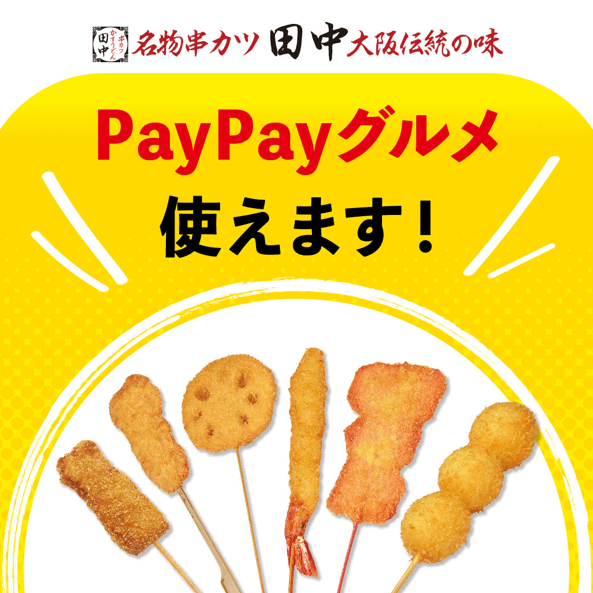 | キャンペーン 概要② | 期間中「PayPayグルメ」から 串カツ田中を予約し予約時の 予約完了画面またはその画面を 印刷したものをレジで提示すると 会計金額から10%OFF 詳細は |