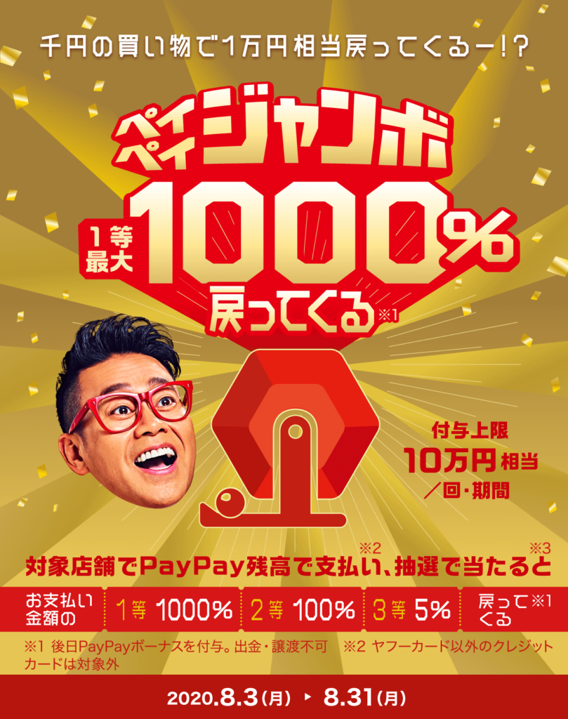 2020年6月1日(月)から開始される「PayPayジャンボ」は、対象のオンライン加盟店でPayPay残高を利用すると抽選で最大1,000%(決済金額の10倍)のPayPayボーナスがもらえるキャンペーンです。