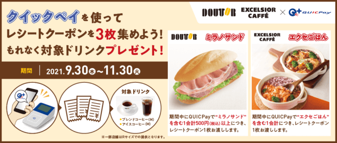| キャンペーン 概要 | QUICPayを利用し エクセごはんを含む 1会計で発行される レシートクーポンを3枚集めると 対象ドリンクをもれなくプレゼント |