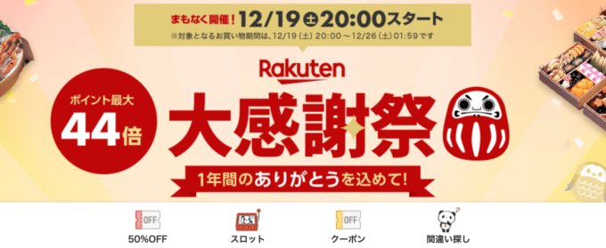 2019年の楽天大感謝祭は2019年12月19日(木)20:00~12月26日(木)1:59で実施されました。