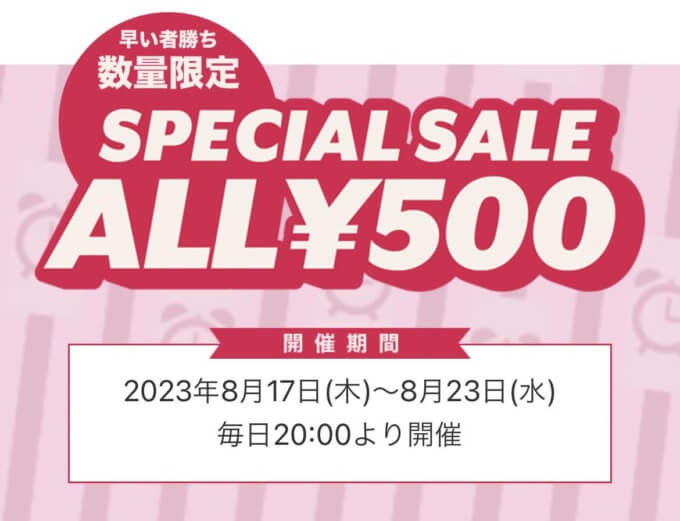 ALL500円セールは2023年8月17日(木)から2023年8月23日(水)まで毎日20:00より開催しています。