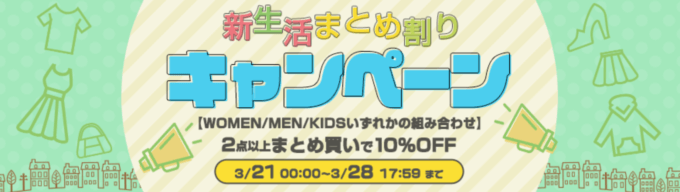 | キャンペーン 概要 | WOMEN、MEN、KIDSの いずれかの組み合わせで2点以上 まとめ買いすると10%OFF |